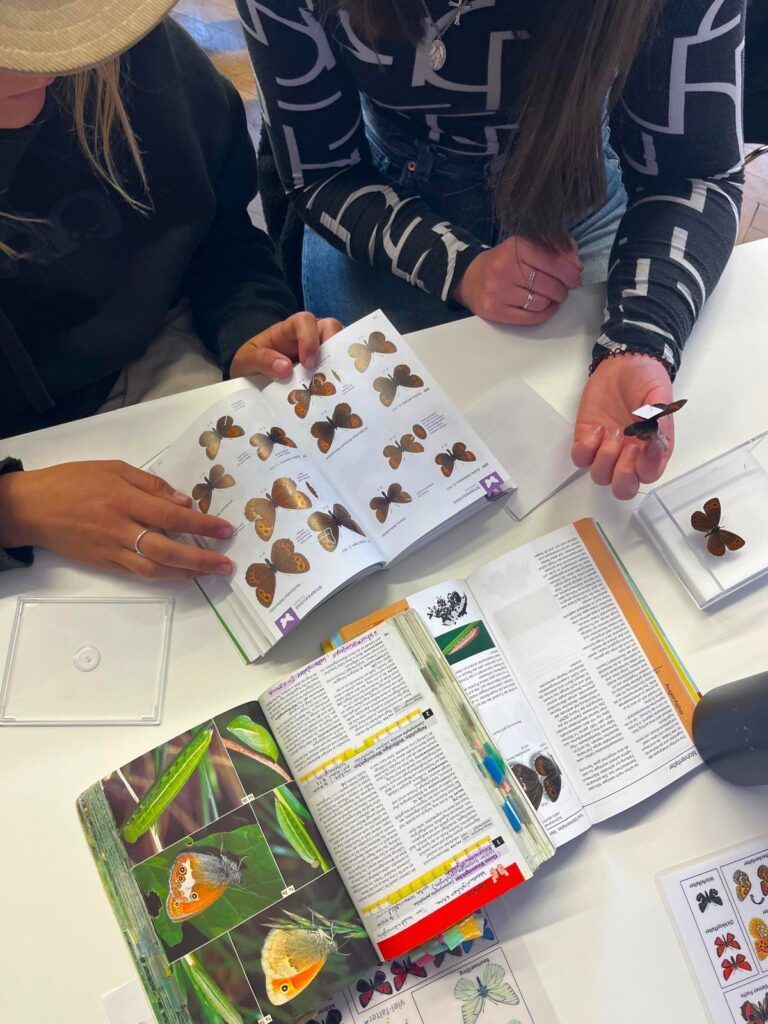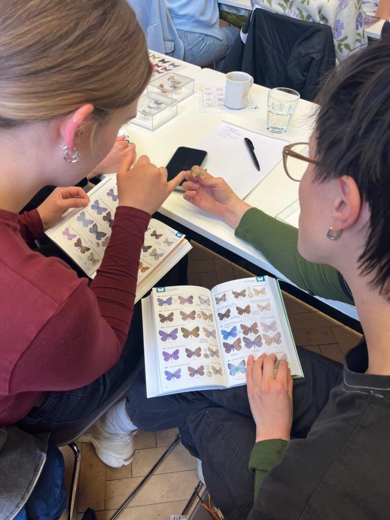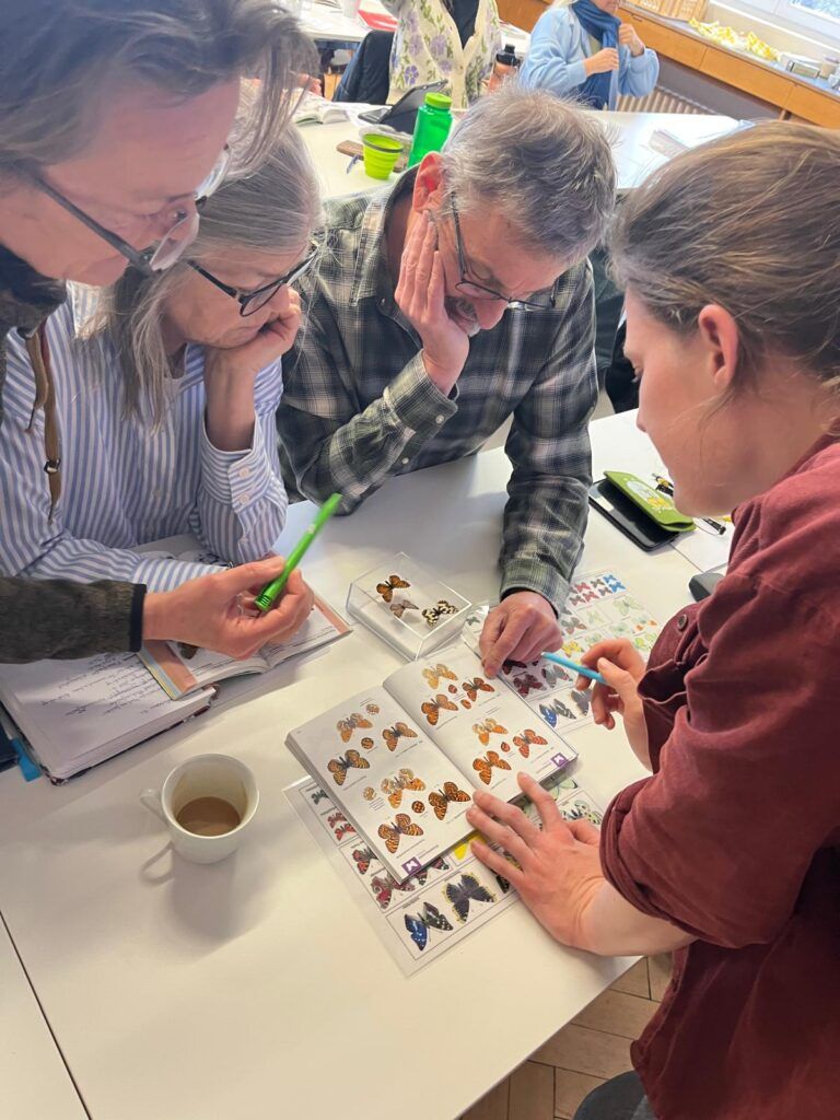 Durchgeführt wurden die Kurse vom Team des Viel-Falter Monitorings sowie dem Schmetterlingsexperten Kurt Lechner. An der Naturkundlichen Station Linz unterstütze uns zusätzlich Gudrun Fuß. Gemeinsam gaben sie einen Überblick über verschiedene Tagfaltergruppen und vermittelten hilfreiche Tipps zur Bestimmung ausgewählter Arten. Besonders spannend war der Blick auf schwierig unterscheidbare Gruppen wie etwa die Mohrenfalter (mit 26 Arten in Österreich) oder den Bläulingen (mit 38 Arten). Das Bestimmen wurde natürlich mit Bestimmungsliteratur und Präparaten direkt erprobt. Während Arten wie der Kleine Fuchs oder der Schwalbenschwanz auf den ersten Blick erkannt wurden, bot der direkte Vergleich ähnlicher Arten eine besondere Gelegenheit, sich wichtige Unterscheidungsmerkmale besser einzuprägen. Auch Geschichten zur Umwelt, zum Verhalten der Arten und zu Veränderungen ihres Vorkommens – unter anderem auch im Zuge des Klimawandels – spielten eine wichtige Rolle.